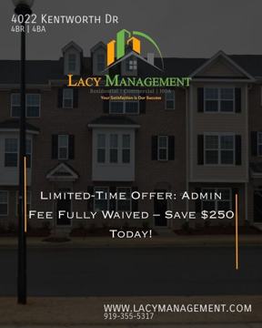 4022 Kentworth Dr is a 4 bedroom, 3 bathrooms apartment for rent. It is located in Holly Springs. It has apartment amenities including carpet, ceiling fan, assigned parking, hardwood floor, dishwasher, deck, microwave, fitness center, in-unit laundry, walk-in closets, and air conditioning. Cats and dogs are allowed, making it a pet-friendly apartment.