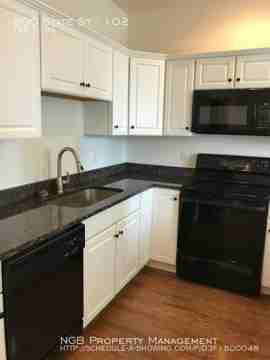 The kitchen features granite counters, dishwasher, built-in microwave and breakfast bar for casual dining. High ceilings and open concept between the kitchen and living area is great for entertaining! The living area has gleaming hardwood floors and over sized windows to let in tons of natural light.