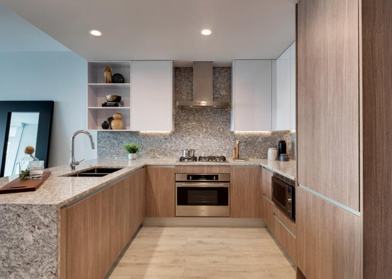 - Granite slab waterfall countertops and full-height backsplashes