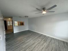 As you enter, you are welcomed by a spacious Great Room and attractive gray-toned laminate flooring that flows throughout the home, creating the look of modern wood flooring. The updated Kitchen features the same stylish flooring, stainless steel finish appliances including smooth-top range, refrigerator, built-in microwave, and dishwasher. From the Kitchen is the access to the screened back porch. Downstairs, you will also find a convenient half bath and a laundry closet with washer and dryer hookups.