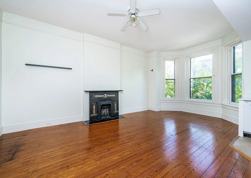 The first-floor features a welcoming living room with a fireplace and a beautiful bay window with original glass, plus an updated kitchen.
