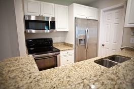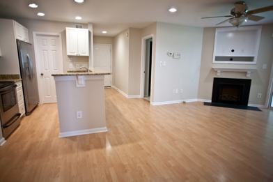 Faux hardwood floors flow throughout the kitchen and living space. The kitchen has stainless steel appliances and granite counter tops.