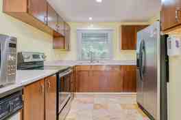 Kitchen features tile floors, plentiful counter and cabinet space, as well as a pantry. Stainless steel range, fridge, and microwave.