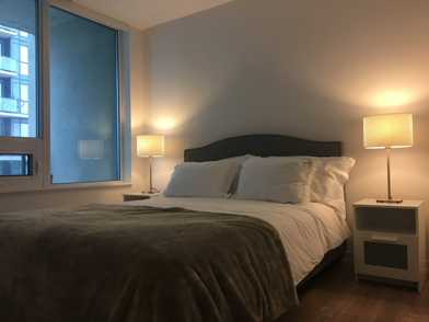 With a chic minimalist style, luxurious finishings and split two bedroom layout, this fantastic 2 bedroom 2 bathroom furnished Liberty Village condo is the perfect downtown abode. Entering the suite you will find the open concept kitchen and living area. Boasting granite counter tops, stainless steel appliances and modern cabinetry. The living area is the perfect place to relax and features direct access to one of the balconies. Thanks to a plush sectional couch, area rug and flat screen TV, the living room is the perfect communal area to entertain your guests. A chic desk and office chair allow you to bring your work home with you if needed. Each bedroom features an elegant bedroom set up as well as fresh linens and a comfortable bed, with the master bedroom boasting a king size bed, a spacious closet as well as a private balcony. Residents at Bliss Condos have access to great building amenities including concierge, a fitness center and rooftop patio with BBQ stations. You will love the local Liberty Village neighbourhood, jam packed with great restaurants and boutique shops. You will have a large variety of coffee shops to choose from including Balzac’s, Second Cup, Starbucks and Tim Hortons. A short walk away you will find and LCBO, Metro and Liberty Village Market. Commuting is easy thanks to the King St street car, Ossington bus and Exhibition Go train all within walking distance. The monthly rate for this rental is $3795 for long term and $3995 for short term, under 1 year. Your rent includes basic cable, 1 underground parking space, water, internet and hydro/electricity. A one time move out cleaning fee of $195 applies. Rent it Furnished provides full property management services in Toronto. Not all properties listed with us are professionally managed by our company and pricing, terms and availability is subject to change.