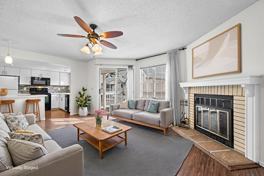 The main living area features an open-concept design with large windows, ceiling fans, and abundant natural light. A wood-burning fireplace creates a warm focal point, while the layout flows seamlessly into the dining area and kitchen—ideal for everyday living and entertaining.
