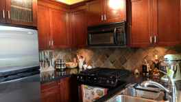 - Kitchen with granite countertops; newer stainless steel fridge; gas stove; microwave; garburator; dishwasher