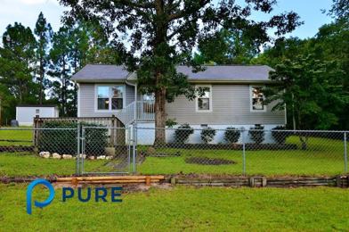 3 bedroom, 2 bathrooms home on an acre of land in a country setting in Lugoff. Half of the property is fully fenced. Front patio and front and back decks. Family room has vaulted ceilings and ceiling fan. Kitchen has newer counters and floors, black side-by-side refrigerator, dishwasher, and smooth top stove. Laundry closet off kitchen. Master has chair rail moldings, ceiling fan, and master bath has tile floors. There is also a storage shed in backyard with power and electrical outlets. Well water and septic system. Has Rently box, so super easy to view.