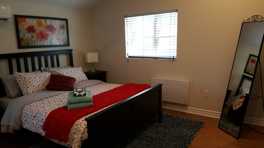A closed bedroom with a queen bed (sheets, bedding provided);