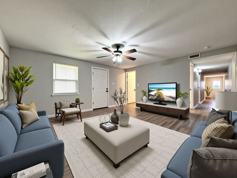 Inside you will find a spacious layout with ample storage space. This home has been freshly painted with new cabinets and stainless steel kitchen appliances.(Not pictured). Off the kitchen, you also have a large dining area with an open concept feel. All three bedrooms are large with natural lighting and tons of closet space. The two full bathrooms have modern upgrades with custom tile tub surrounds.
