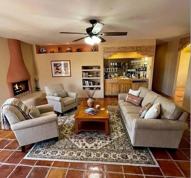 This is a lovely, revitalized, Sante Fe style unfurnished home, with wonderful mountain views. It has a double door entry, walled, newly landscaped front courtyard and attached 2 car garage. There is an expansive great room with high ceilings, a Pueblo style fireplace with raised hearth, there is also a wet bar for entertaining ,The open and airy kitchen, has re-done cabinets, a new dishwasher and the owner will supply a new refrigereator if the tenant needs one.. It also has a breakfast bar and is open to the family or dining room. The large master bedroom has an attached master bath and spacious walk in closet. There is also an indoor laundry room. The flooring is sautillo pavers which have all been redone. the guest bedrooms have new carpeting. Don't miss this charming home. The gardener is included. Some of these pictures have been digitally furnished, the home is offered for rent unfurnished