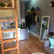 Bachelor suite with character in Roncesvalles. Located at 2057 Dundas St W. Ladder leads to a small loft space that past tenants have used to put a double mattress. Appliances; gas stove and mini bar fridge. Pet friendly.