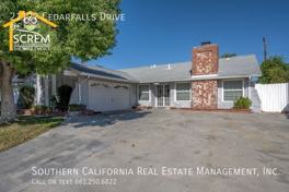 This charming single-story home in Santa Clarita features four bedrooms and an additional bonus room. Upon entering through the double doors, you are greeted by an open living room with a brick fireplace, a mantle, and laminate flooring that resembles wood. Adjacent to the entrance is the bonus room, which includes a ceiling fan and access to the garage. The spacious kitchen boasts granite countertops, beautiful wooden cabinets and drawers with brushed bronze hardware, a tiled backsplash, and stainless-steel appliances, including a gas stove, single oven, dishwasher, microwave, and refrigerator (not pictured). The dining area, conveniently located just off the kitchen, has a large sliding glass door that opens to the private backyard. The backyard features a covered patio with a ceiling fan and fruit trees. There are three guest rooms, each equipped with ceiling fans and wood laminate flooring, as well as a full guest bathroom. The primary bedroom is spacious and includes a ceiling fan and an attached bathroom with a walk-in shower. Additionally, the home has a two-car garage that includes a full-size washer and dryer. This property is conveniently close to an elementary school, shopping centers, and restaurants. *The owner may consider a small pet.