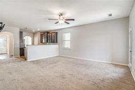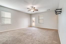 Spacious kitchen anchors the home with granite countertops, designer wood cabinetry, brushed nickel hardware, and a full suite of energy-efficient appliances, creating a space that is both stylish and functional. The private primary suite includes a walk-in closet and an upgraded en-suite bath with built-in cabinetry, a garden tub, and a separate shower. Additional upgrades include energy-efficient windows, insulation, doors, and thermostat, contributing to lower utility costs and year-round comfort. Prewired security, high-speed internet capability, and a spacious two-car garage. Exterior includes sprinkler system and fully fenced backyard.