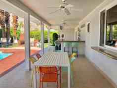 This midcentury glamour home is tastefully and comfortably appointed. It is perfect for entertaining and relaxing. Enjoy this quintessential desert oasis. The resort-like private backyard has breathtaking mountain views, newly surfaced sparkling pool, poolside wet bar, firepit, fireplace, covered dining, and gas BBQ. The interior has an open floor plan with lots of natural light, a sophisticated living room, elegant dining area, cozy den, and large modern kitchen, all with pool and garden access and stunning views of the San Jacinto mountains!