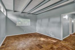 Step inside to an open floor plan filled with natural light and fresh interior paint. Exposed beams and wide windows highlight the living and dining areas, while a striking brick accent wall adds texture and timeless appeal. The kitchen’s layout balances functionality and creativity, featuring extended counter space and a breakfast bar that encourages easy flow between rooms.