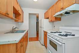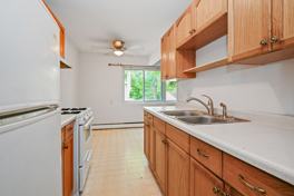 Large living room with built-in air conditioner, dining area, and galley style kitchen. Bedrooms are generously sized. Full bath. Great natural light