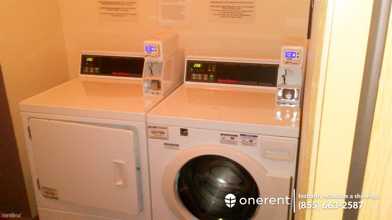 The nice unfurnished interior features hardwood, tile, and carpet floors. The kitchen is complete with granite countertops, cabinet storage, and stainless steel appliances such as a refrigerator, an electric stove, a dishwasher, and a garbage disposal. Other appliances include a coin-operated washer with dryer and for climate control, centralized heating is installed.