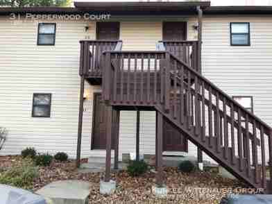Living room with fireplace. Kitchen includes stove, refrigerator & dishwasher. Stacked washer/dryer in unit. Patio with storage closet.
