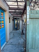 17ft ceilings, cozy loft, built in bookshelves, private flagstone front patio with delicious grapes growing over the entrance for shade and jams! Beautiful stained-glass window on the east side lines up with the summer solstice and paints the stairs with beautiful colored light.