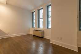 This renovated studio apartment home features a spacious layout, over-sized windows, new hardwood flooring, and a stainless appliance package.