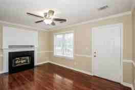 Inside, hardwood flooring runs through the main living areas and bedrooms, bringing warmth and continuity throughout the home. The living room offers an inviting space with a hearth feature, crown molding, chair rail trim, and natural light that brightens the room. The nearby dining area connects easily to the living space, creating a layout that works well for both everyday living and gatherings.