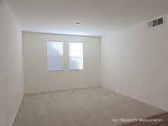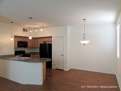 Spacious 3 bed, 2 bath condo with a 1-car detached garage located in a gated community featuring a pool and spa. The kitchen offers granite countertops and black appliances, with a separate dining area for added space. Vinyl wood-look flooring covers all wet areas, and ceiling fans are installed throughout. The large primary bedroom includes private patio access, while the primary bath features dual sinks and a walk-in closet.
