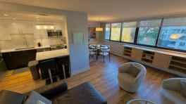 Set at 13th Avenue and Fir Street, this well-kept corner suite offers an easy, open layout that makes day-to-day living simple. The kitchen features stainless-steel appliances, plenty of cupboards, and an island that doubles as a breakfast bar. A nearby dining area seats four to six, and the bright living room—framed by floor-to-ceiling windows—comes furnished with a leather sectional and mounted flat-screen TV for relaxed evenings.