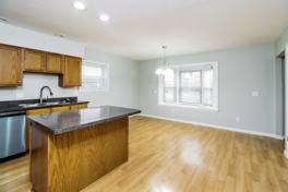 The main level opens into a spacious living area finished with carpet flooring, creating a comfortable central gathering space. Just beyond, the kitchen and dining area are finished with hardwood flooring, offering a natural transition between rooms. The kitchen features wood cabinetry, generous counter space, and a central island that adds functionality and flow. Fresh interior paint throughout the home gives each space a clean, cohesive feel.