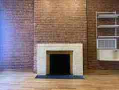 + Exposed brick wall with decorative fireplace and mantle