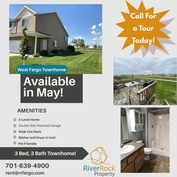 Beautiful townhome located in the sought-after Westport Beach area of West Fargo! This 3-level split offers a double-stall attached garage and a walk-out deck, perfect for enjoying the outdoors. The home features 3 bedrooms and 3 bathrooms, including a spacious walk-in closet, with a washer and dryer included for added convenience. Pet-friendly to cats and both small and large dogs with no weight limits, plus plenty of yard space to enjoy.