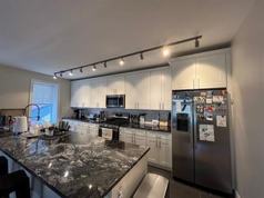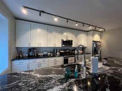 This large, second floor apartment has tons of exposed brick, in unit washer & dryer, high efficiency HVAC system with central air, and private access to a deck on the back and a covered balcony in the front. The custom kitchen has 42" high cabinets, top tier granite counters, a sink that looks out into the living room, and stainless steel appliances including dishwasher, built in microwave, high BTU gas stove, and side by side refrigerator with ice and water in the door. Each of the three bedrooms is large with a walk in closet and ceiling fan. The main bathroom has two sinks and a full size tub. The primary bedroom has a private bathroom and a shower with glass doors. There's a stairwell that leads directly to the basement for extra storage. Landlord pays water, sewage and trash. Tenant pays gas and electric.