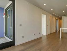 Wide-plank walnut flooring throughout living and bedroom spaces.