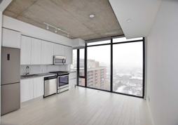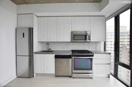 An Open Concept Loft With 9' Exposed Concrete Ceilings, Floor-To-Ceiling Windows With Blinds, And Hardwood Floors. Kitchen Features Modern Euro-Style Cabinets, Stone Counters, Glass Back Splash, Gas Cooking, & Stainless Steel Appliances.