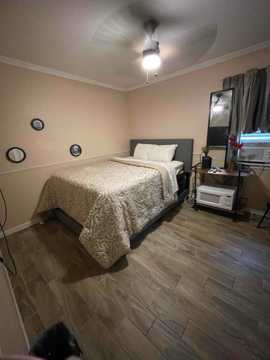 I'm renting out one bedroom inside My three bedroom home. All utilities are paid for within the rent. The house has its own Wi-Fi network, washer, and dryer. And this bedroom has its own television, mini refrigerator, and microwave as well.