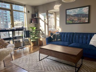 Unit comes with blue couch (which folds out to day bed), queen size bed, built-in storage, and dressers. Kitchen is fully equipped with stove, oven, fridge, dishwasher, microwave, en-suite washer and dryer.