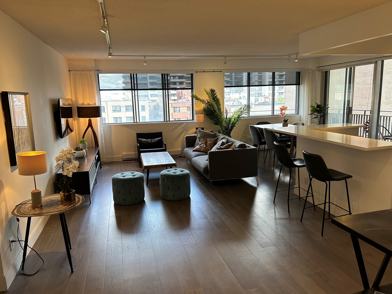 Golden Mile Downtown Spacious and Luxurious 2 bedroom, 2 bathroom fully Air Conditioned /Central AC! Corner apartment fully furnished with wrap around balcony and stunning views of Montreal, St Lawrence River and the Mountain. Utilities are, WiFi, hydro, cable. Call to lease at 514 379 4531. Walking distance to McGill, Peel Metro, Museums, best shopping and restaurants and the beautiful Mount Royal just behind. Indoor heated parking. Rooftop outdoor heated pool. All new gorgeous hardwood flooring throughout unit. Walk Score 98! You will not lack space! The living room is very spacious and bright, with a very modern open-concept kitchen; there are also 2 large rooms, 2 full bathrooms as well as a large corner balcony. Security controlled building with garage access. Fully renovated new Kitchen. The building features: rooftop swimming pool, 24h security, Interior garage, elevators, luxurious reception, air-conditioner corridors, garden in back…Get ready to be amazed! If you are interested in a visit or if you need information, please contact Michelle Settles at 514 379 4531. Apartments available for February 2, 2026