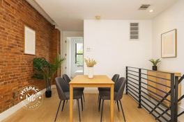 Beautifully designed, spacious 1-bedroom duplex with a large open basement. This home features central heat and A/C, exposed brick throughout, hardwood floors, and generous closet space. The sunny bedroom highlights a striking exposed brick wall, while the modern kitchen offers ample room to cook and entertain.