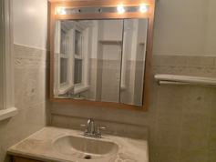 Take refreshing showers in this specially designed porcelain tiles 5' tall and matching on the floor in this awesome bathroom with matching mirrored oak vanity, cabinet and shelves top to bottom.