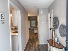 The kitchen offers ample space for a breakfast table, making it easy to enjoy casual meals at home. The primary bedroom includes a walk-in closet and a private bathroom, providing a comfortable retreat. Step outside to a smaller fenced-in back patio with an awning, ideal for relaxing outdoors with added privacy and shade.