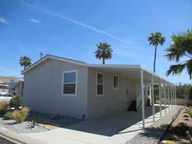2021 Champion model in the 55+ gated community of Skys Haven. Open floor plan with 2 spacious bedrooms, 2 full bathrooms, Carpet and wood laminate flooring throughout the unit. Kitchen equipped with Whirlpool appliances, granite countertops, and plenty of storage space. Ceiling fans in every room along with a fireplace in the living room. Desert landscaping for easy maintenance. The community features a clubhouse, swimming pool, and spa. Close to Palm Springs, shopping, dining and entertainment.