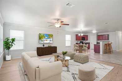 Updated, spacious home in Remington Point located within Eagle Mountain ISD. Fresh, neutral paint throughout, updated designer flooring featuring 18inch tile laid on the diagonal with travertine transitions and new luxury vinyl plank! Bright, updated lighting with two inch blinds help to make this an amazing space! As you enter the home, you're greeted with a large entry hall with two bedrooms and a full bathroom at the front of the house. To your left, as you walk down the impressive entry hall, you'll find a large media room with double French doors and built in shelving. The media room is buffered with a spacious transition area which also leads to a generous sized laundry room. The kitchen is oversized with a long breakfast bar and opens to the living room. There is a nice dining space combined with the kitchen also open to the living room. The primary suite includes a second linen closet off of its private hall and is very large. The primary suite bath is very nice and has a big walk in closet. The most notable features of the home are its flowing floor-plan, very spacious rooms, and the beautiful paint and tile work throughout. Schedule your tour today, and make this your new home!