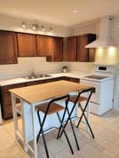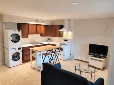 The suite is not furnished, but the kitchen has a full-sized fridge, stove & range hood, and washer/dryer. All the windows are new.