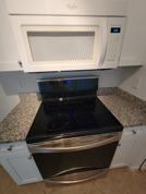Modern kitchen with range/oven, refrigerator, dishwasher, and microwave