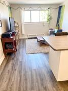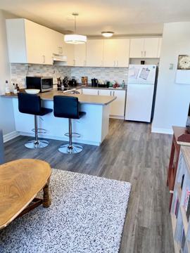 Brand new, high-quality laminate flooring looks great and is easy to maintain. Renovated, open concept chef’s kitchen with breakfast bar! Bedroom is easily large enough for a queen bed and a couple of dressers.