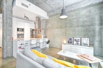 Magnificent condo / loft in the heart of downtown. Historic building with industrial design. Open and friendly space. Modern architecture, high ceilings, brick walls, very large windows. Common roof terrace with a splendid view, bbq, gym and games room