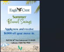At Eagle Crest Apartments, we make the good life attainable. With 1, 2, 3 & 4 bedroom apartments available, we let you decide how much space you need to put your feet up and settle in comfortably. Our ideal location in Lakewood, Colorado, places you near everything you need and provides plenty of opportunities for fun and adventure right near home. Our close proximity to the Garrison Light Rail Station makes getting around easy. Start living the life you’ve always wanted and make Eagle Crest Apartments your new home.
