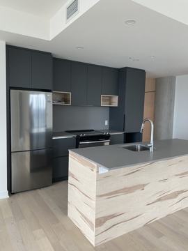 This exquisite corner unit is a sunny and open living space, with a modern kitchen, brand new appliances, a large balcony facing the the River, large windows throughout the unit, high ceilings, gorgeous ensuite master bathroom, a washer and dryer hookup in a hidden space, and stunning high end finishings. This condo is conveniently located as it is near numerous walking trails, bicycle paths, waterfront parks, local stores as well as the future REM station.