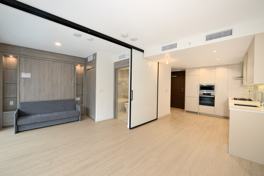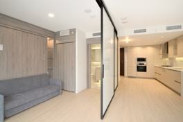 * 1 bedroom with built-in wall bed, open kitchen/dining/living, den
