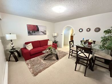 The living room is spacious open concept with contemporary dining table with seating for 4. Includes HD Apple TV device with Netflix.