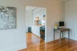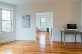 Spacious top floor unit with 3 generous "real" bedrooms, all w/ good-sized closets. Large living/ dining area. Good ceiling height and a large wall of windows in every room. Since this is a corner unit with no buildings close by to block views , every room has amazing natural light. The eat-in kitchen is really special. Feels like Paris. The rounded wall is a nice architectural feature that also allows you to tuck in a table for cozy dinners. Crisp white kitchen cabinets and stainless back-splash are perfect as is. Bathroom is in good condition but ready for your personal touch. Fresh, neutral painted & newly refinished hardwood floors throughout. Move-in ready. Well-maintained building. Unit includes in-unit laundry. The assigned parking space is for an additional $200 per month.